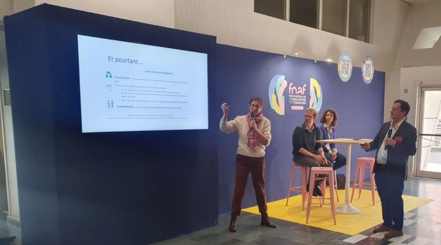 Cécile Bazin (Recherches & Solidarités) a rappelé les principales évolutions issues de l’étude de La France Bénévole 2025. Si l’étude confirme une forte différence d’engagement selon le niveau de diplôme, elle montre surtout que les personnes les moins diplômées — une fois engagées — s’investissent proportionnellement davantage dans la vie associative.